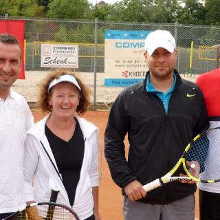 Bei durchwachsenem Wetter wurden die Spiele am Samstag, den 23.08.2014, auf den TSV-Tennisplätzen in 2 Gruppen ausgetragen. Nach der Begrüßung von Abteilungsleiter Klaus Maier konnten die Spiele beginnen. Die Beteiligung mit 9 Mannschaften war in diesem Jahr erfreulich hoch. Für die Fa.AbbVie spielten Wolfgang Schreiner, Andreas Bartsch, für die Fa.BestiMed Roland Buchholzer, Karl-Heinz Rechert, für die Commerzbank Arnel Mesic, Marc Baumgärtner, für die Fa.Compas Thomas Sieberling, Waltraud und Roger Halling, für die Polizei Achim Bossek, Gerhard Matz, für die Fa.Schenk Gabi Schenk und Stefan Hildebrand, für die Fa.Von der Heydt I Elvira Brechtel, Markus Fröhlig, für die Fa.Von der Heydt II Alexander Strohmeier, Christian Tolone und für die Württembergische Versicherung Andreas und Thomas Limmer.