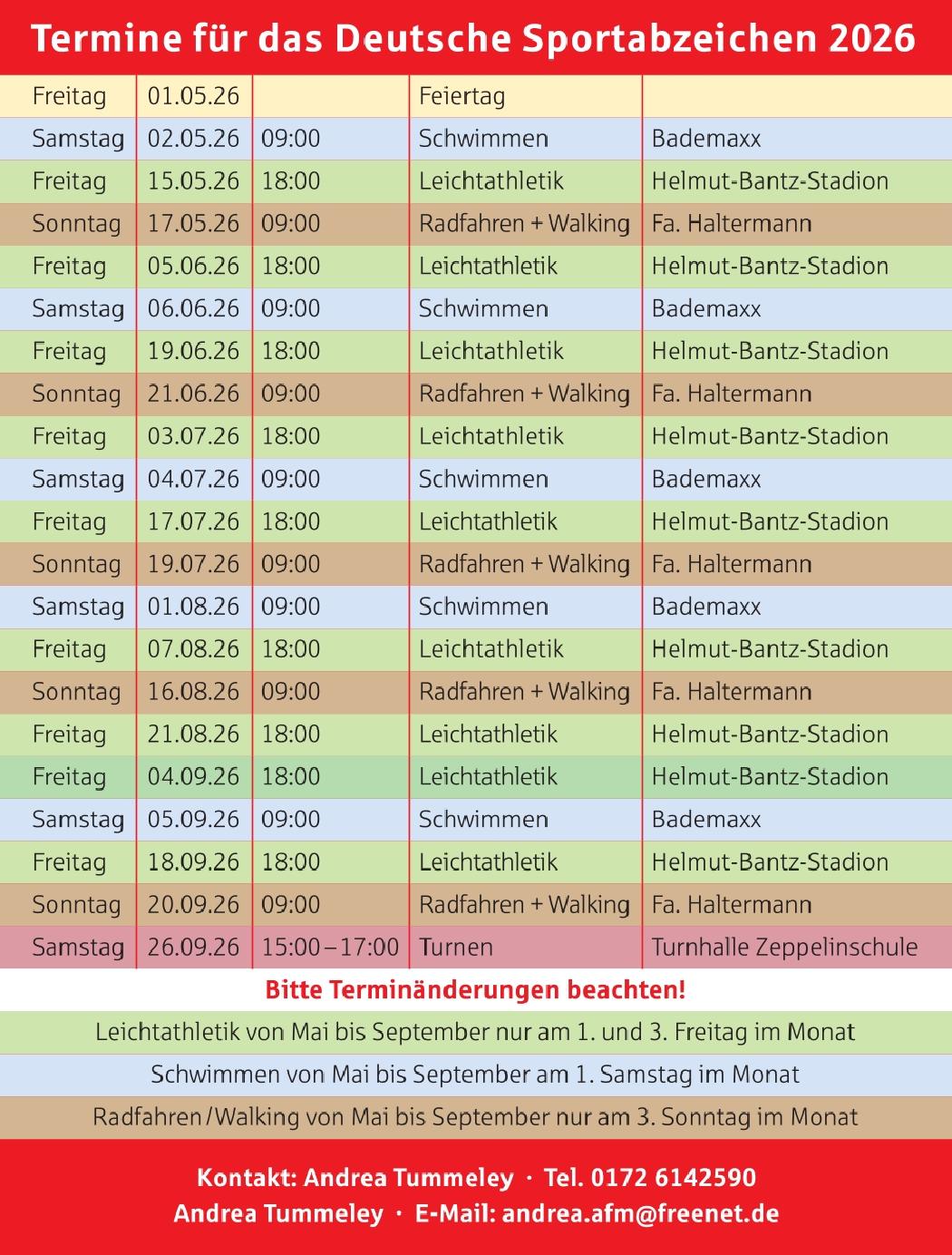 Die Terminplanung für das Jahr 2026 liegt vor und sie finden hierzu alles Wissenswerte hier. Andrea Tummeley steht für die örtliche Organisation des Deutschen Sportabzeichens, das eine Einrichtung des Sportbundes Pfalz ist und vom TSV Speyer und Sponsoren, wie den Stadtwerken Speyer und der Sparkasse Vorderpfalz ebenfalls gefördert wird. Finden Sie Ihre Termine in der Übersicht und die Prüferinnen und Prüfer freuen sich auf eine gute Ressonanz. Viel Erfolg.