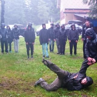 Es gibt kein schlechtes Wetter, nur unpassende Kleidung Sensei Christof Dahmen demonstriert eine Abwehr gegen einen Messerangriff