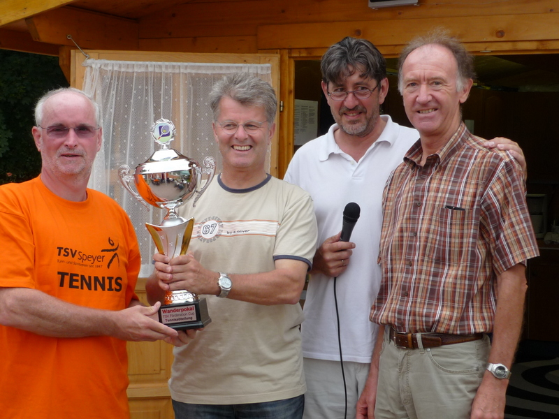 Anlässlich des 25-jährigen Jubiläums hat die Tennisabteilung des TSV Speyer am 05.07.2009 erstmalig den Förderer Cup ausgetragen. Als Dank an unsere Sponsoren wurde an diesem Tag das Tennisturnier durchgeführt. Eingeladen waren jeweils Spieler der Firmen Abbott GmbH& Co.KG, Compas GmbH, Intersport Scheben GmbH, Kreis- und Stadtsparkasse Speyer, LVM Versicherungen – Volker Föhr, Stadtwerke Speyer GmbH, Albert Schenk GmbH, Sport Zimmermann, Volksbank Kur- und Rheinpfalz eG und Von der Heydt GmbH. Nach der Begrüßungsrede unseres Tennisabteilungsleiters Klaus Maier und des TSV-Vorstands Wolfgang Behm konnten bei gutem Wetter die Spiele beginnen. Gemeldet haben sich 8 Spieler von unseren Förderern. Es wurden 12 Einzel- und 7 Doppelspiele ausgetragen. Auch wenn die Spielstärken der Teilnehmer recht unterschiedlich waren, so kamen doch alle auf ihre Kosten, denn der Spaß stand dabei immer im Vordergrund. Die Sieger standen bereits nach den Einzelspielen fest. Die Siegerehrung wurde von unserem Abteilungsleiter Klaus Maier und dem TSV-Vorstandsmitglied Herbert Kotter als Stifter des Pokals durchgeführt. Der Wanderpokal ging an das Mannschaftsteam Volksbank Kur- und Rheinpfalz eG und die Compas GmbH, vertreten durch Uwe Mahl und Thomas Sieberling, und befindet sich nun für ein Jahr in den Räumen der Volksbank Speyer. Nachdem tagsüber der von unseren Tennisdamen gespendete Kuchen großen Anklang fand, begann anschließend der gemütliche Teil. Nach der Stärkung unserer Besucher mit Steak, Bratwurst und Salat saß man noch einige Stunden unterhaltsam beisammen.